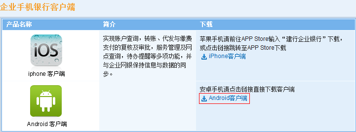 下载路径2:登录我行官网首页,点击“公司机构客户”,在“企业网上银行登录”下方的“下载中心”按钮,进入下载页面,找到“企业手机银行客户端”菜单,点击“Android客户端”即可下载。