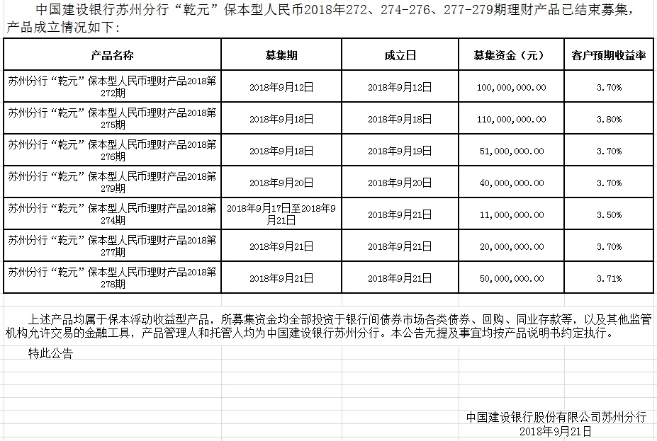 中国建设银行苏州分行“乾元”保本型人民币2018年272、274-276、277-279期理财产品成立公告