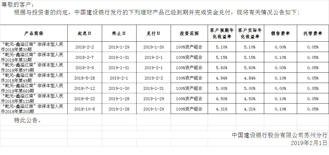 中国建设银行理财产品终止及清算公告