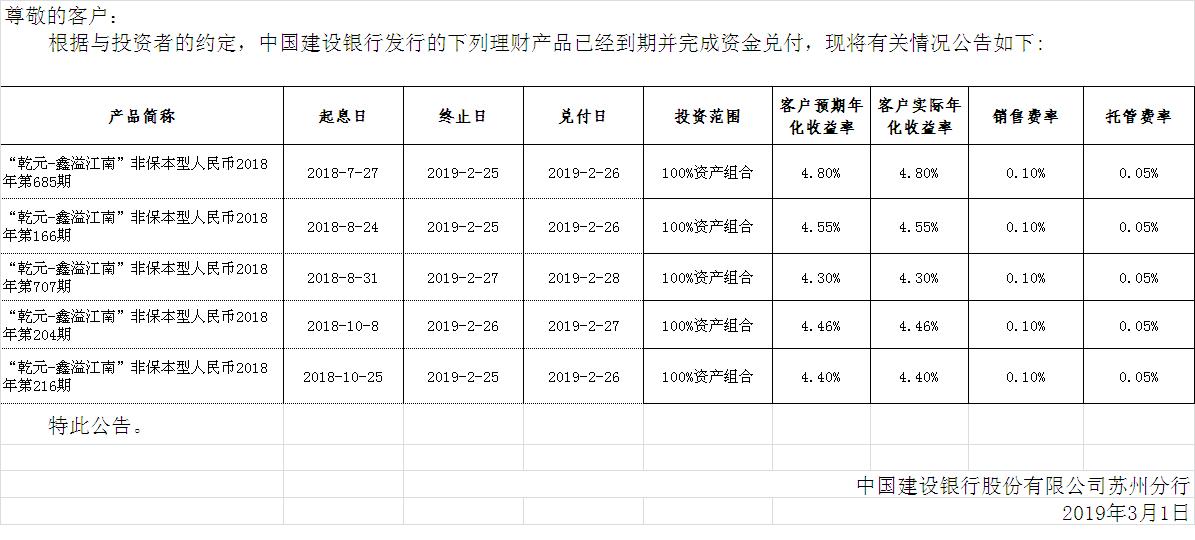 中国建设银行理财产品终止及清算公告