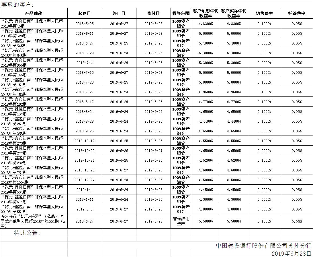 中国建设银行理财产品终止及清算公告