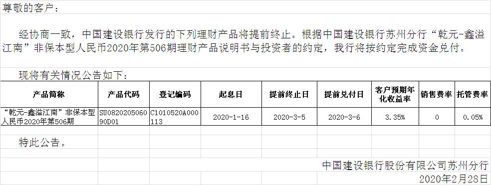 中国建设银行苏州分行“乾元-鑫溢江南”非保本型人民币2020年第506期理财产品提前兑付公告